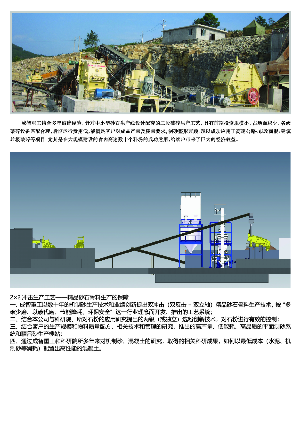 2×2沖擊生產(chǎn)工藝——精品砂石骨料生產(chǎn)的保障 一、成智重工以數(shù)十年的機制砂生產(chǎn)技術(shù)和業(yè)績創(chuàng)新提出雙沖擊(雙反擊+雙立軸)精品砂石骨料生產(chǎn)技術(shù),按 “多破少磨、以破代磨、節(jié)能降耗、環(huán)保安全”這一行業(yè)理念而開發(fā)、推出的工藝系統(tǒng); 二、結(jié)合本公司與科研院、所對石粉的應(yīng)用研究提出的兩級(或獨立)選粉創(chuàng)新技術(shù),對石粉進行有效的控制; 三、結(jié)合客戶的生產(chǎn)規(guī)模和物料質(zhì)量配方、相關(guān)技術(shù)和管理的研究,推出的高產(chǎn)量、低能耗、高品質(zhì)的平面制砂系統(tǒng)和精品砂生產(chǎn)樓站; 四、通過成智重工和科研院所多年來對機制砂、混凝土的研究,取得的相關(guān)科研成果,如何以最低成本(水泥、機制砂等消耗)配置出高性能的混凝土。